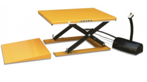 o          Lage heftafels met oprij plaat (deze kunnen zo laag tot de grond dat een pallet met een pompwagen erop of erin gereden kan worden, aandrijving is dan naast de tafel).